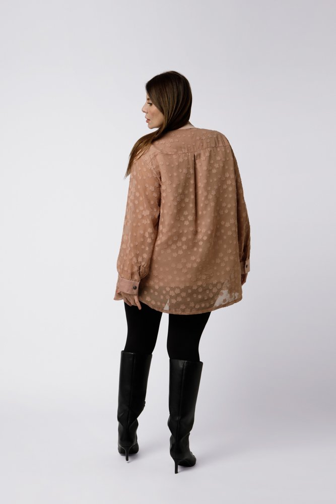 Le travail de relief et de transparence subtile donne du caractère à cette chemise grande taille, tout en restant facile à porter. Sa longueur idéale permet de la porter aisément au quotidien. Facile à associer, la chemise Valentine se porte avec un jean, un pantalon fluide ou un legging, accompagnée de baskets ou de bottines selon le style recherché.