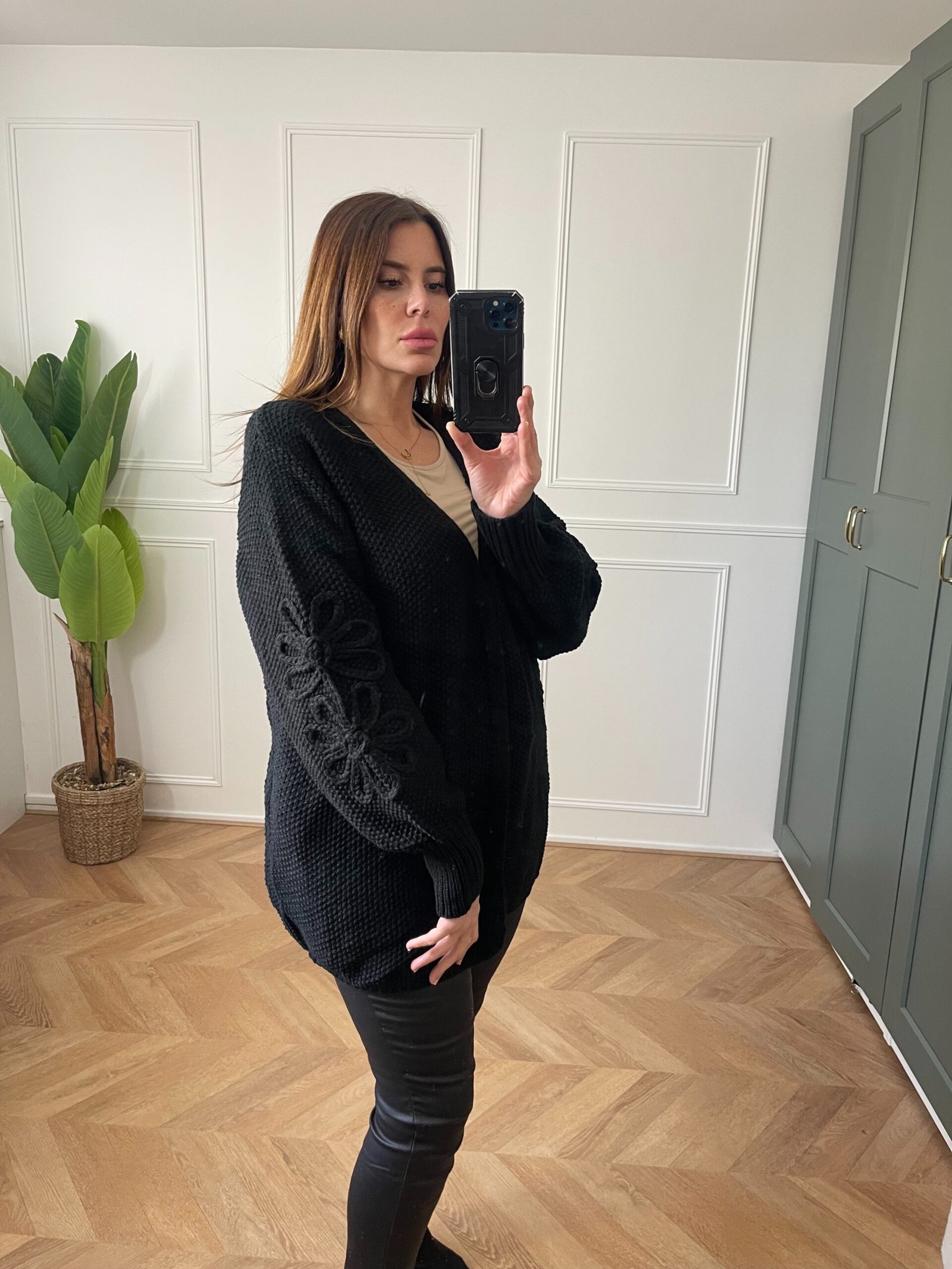 Ce gilet en maille revisite le cardigan classique avec une dimension couture. Sa maille texturée, dense et structurée, dessine une ligne enveloppante au tombé net et élégant. Porté ouvert sur un top ou une blouse, il encadre la silhouette avec modernité.Les manches longues se distinguent par un travail de fleurs en relief subtilement intégrées dans la maille.