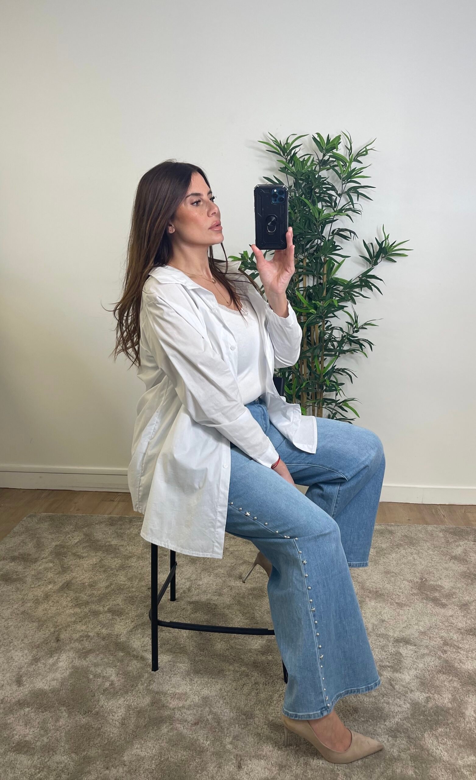 Pour les femmes aux hanches généreuses, le jean wide leg crée une ligne fluide qui allonge visuellement les jambes.