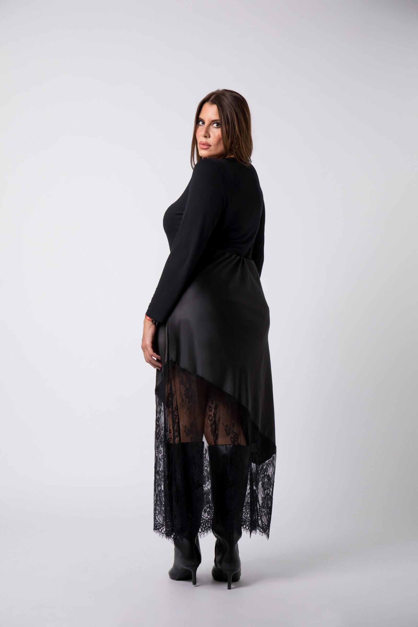 La Jupe noire Satin & Dentelle Monica séduit par son allure raffinée et son jeu de matières subtil. Le satin, lisse et lumineux, apporte une touche chic et élégante, et le bas en dentelle asymétrique ajoute du cachet ainsi qu’ une note résolument féminine. Cette combinaison harmonieuse donne immédiatement du style à la silhouette.