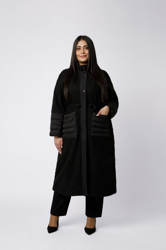 Le manteau bi-matière Mathilde est un manteau femme grande taille au style moderne et structuré, proposé en noirL’intérieur du manteau est doublé du col jusqu’au bas du dos, garantissant une chaleur optimale tout en conservant un porté confortable. Sa coupe  convient parfaitement aux morphologies pulpeuses, offrant une silhouette équilibrée et élégante. Une ceinture de serrage à la taille permet d’ajuster la coupe selon l’envie : portée lâche pour une allure droite et épurée, ou légèrement resserrée pour marquer la silhouette.
