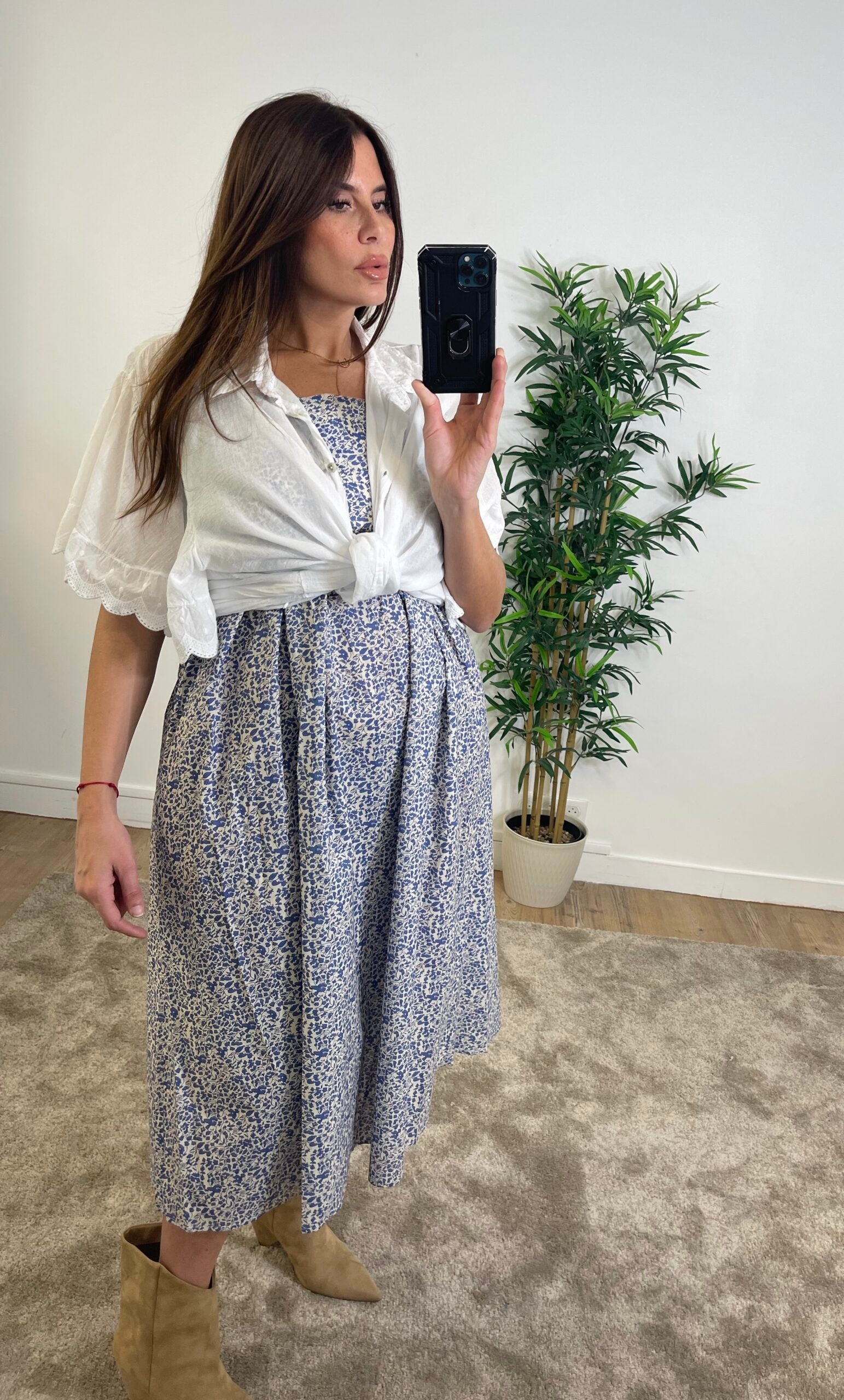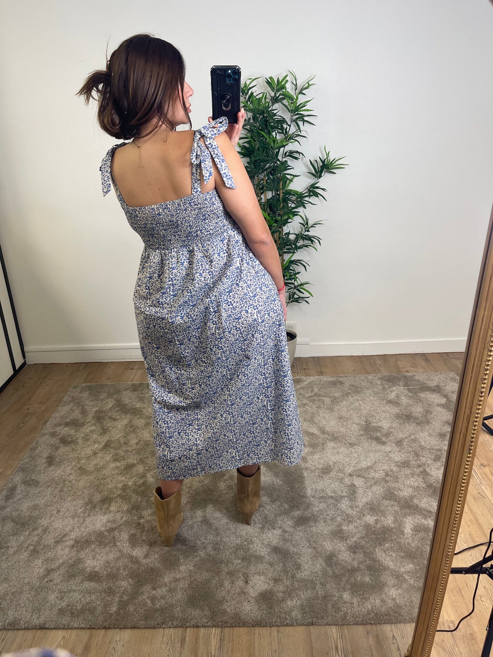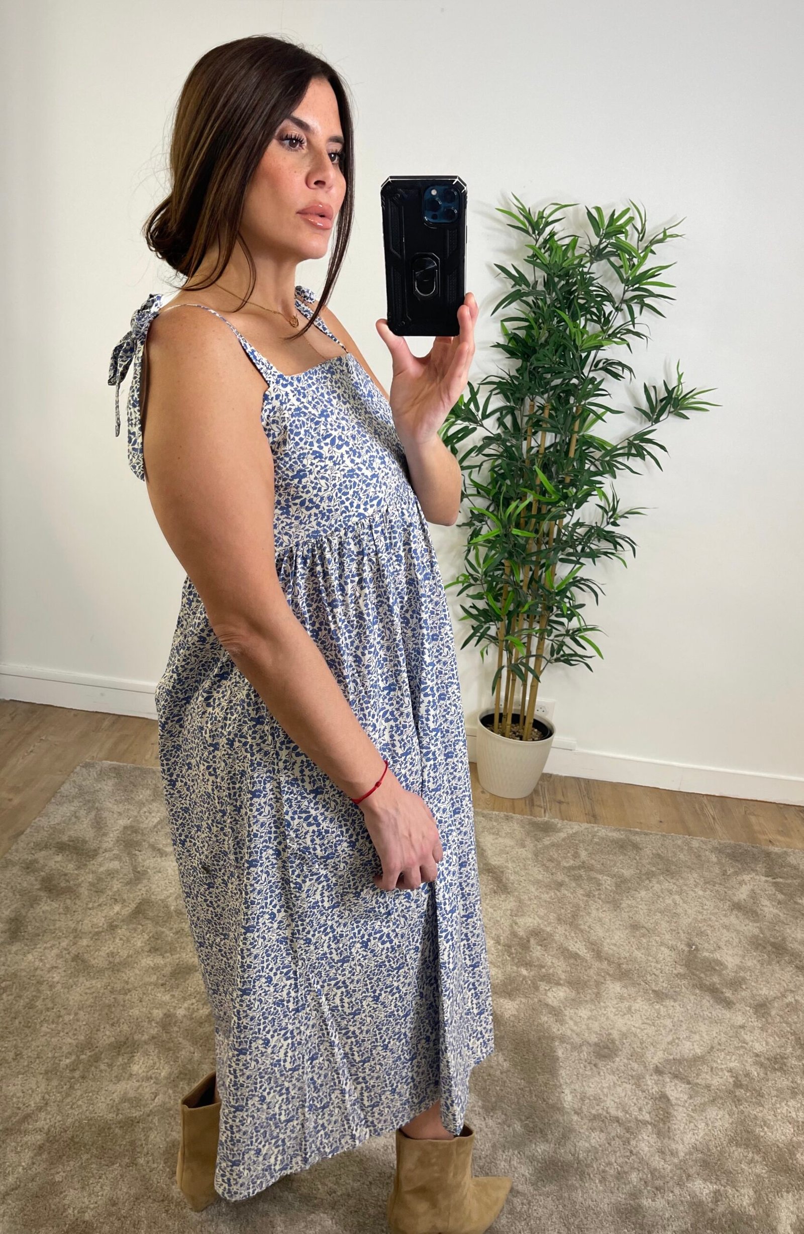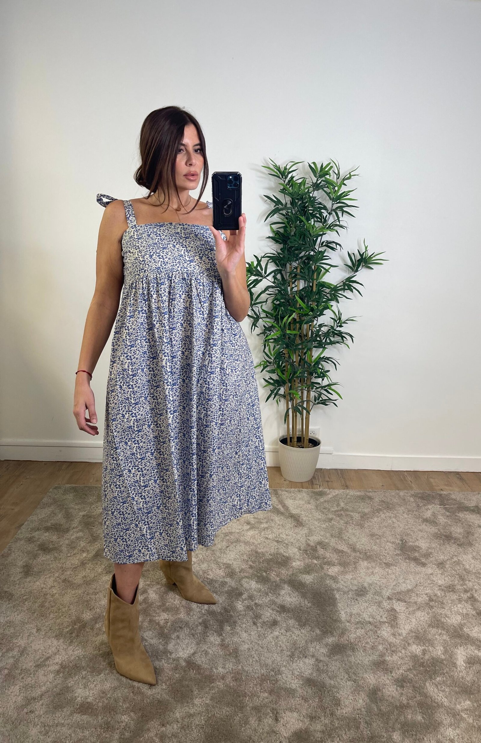 Robe midi ample à encolure carrée avec bretelles larges à nouer sur les épaules. Coupe fluide avec fronces sous la poitrine pour plus de volume. Imprimé feuillage sur fond clair.