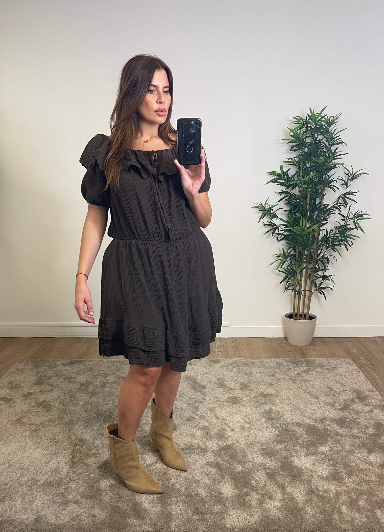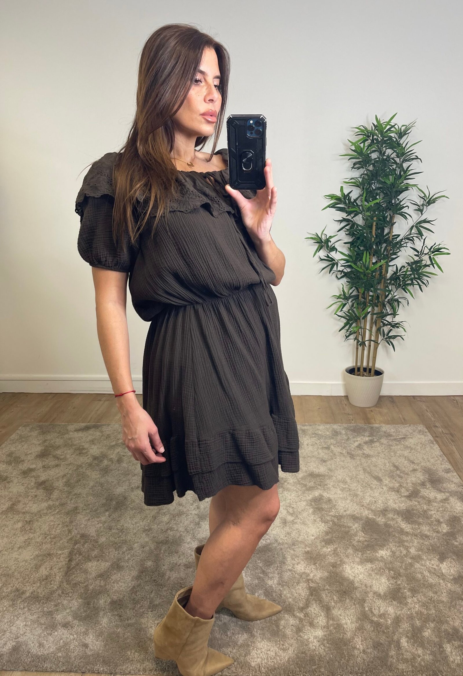 La taille subtilement marquée structure la silhouette et crée un tombé harmonieux qui met en valeur la ligne de la robe. Les manches courtes légèrement texturées renforcent son esprit bohème chic, tandis que la jupe légèrement évasée et rythmée par un volant bas offre une allure aérienne et féminine.