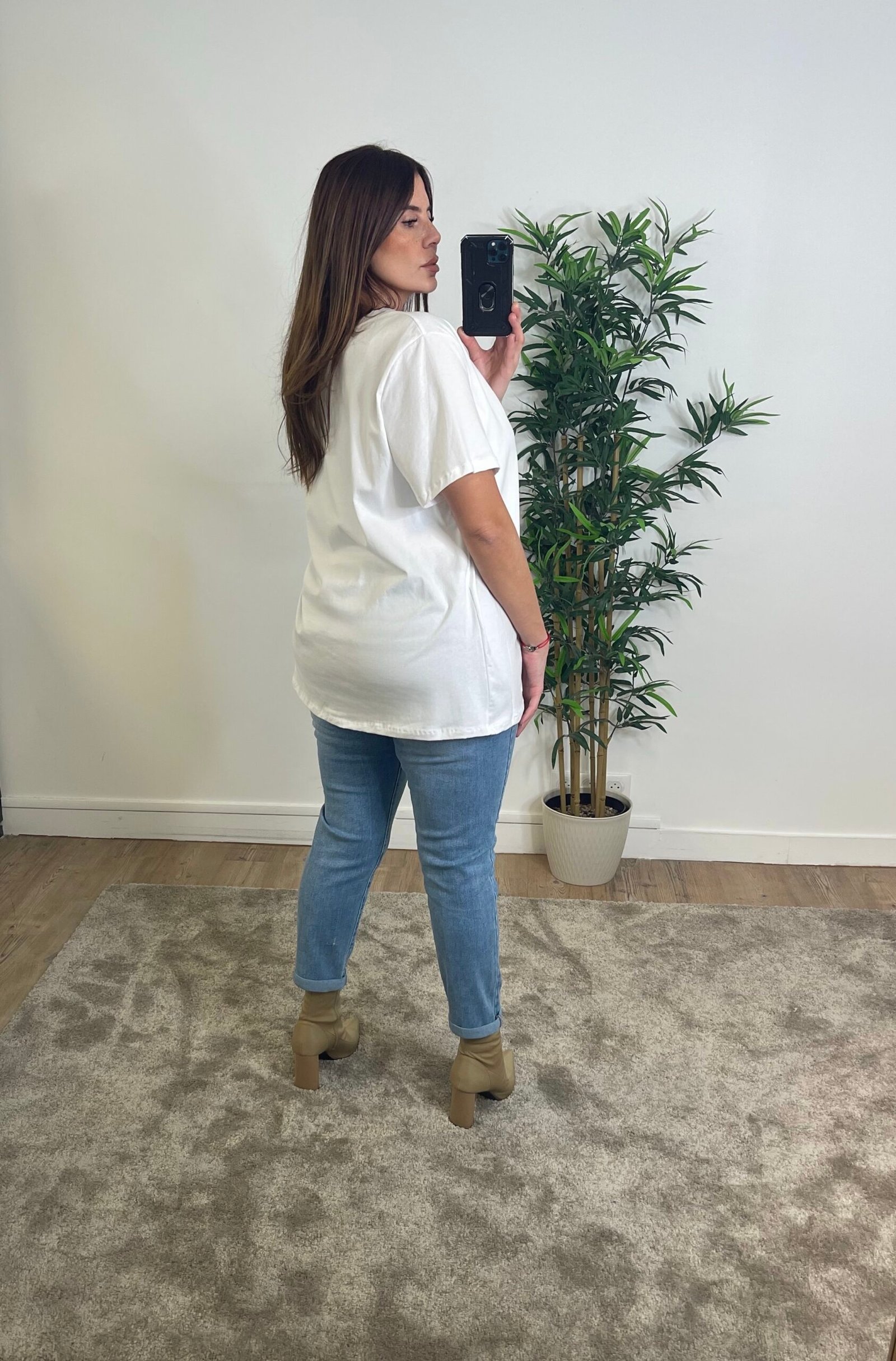 Ce t-shirt blanc grande taille revisite l’essentiel du vestiaire casual avec une touche artistique et solaire. Son imprimé citron aux teintes vibrantes, subtilement encadré d’un motif graphique rose, apporte relief et caractère à la silhouette. Une pièce qui évoque l’élégance estivale et l’esprit Riviera, tout en restant résolument moderne.
