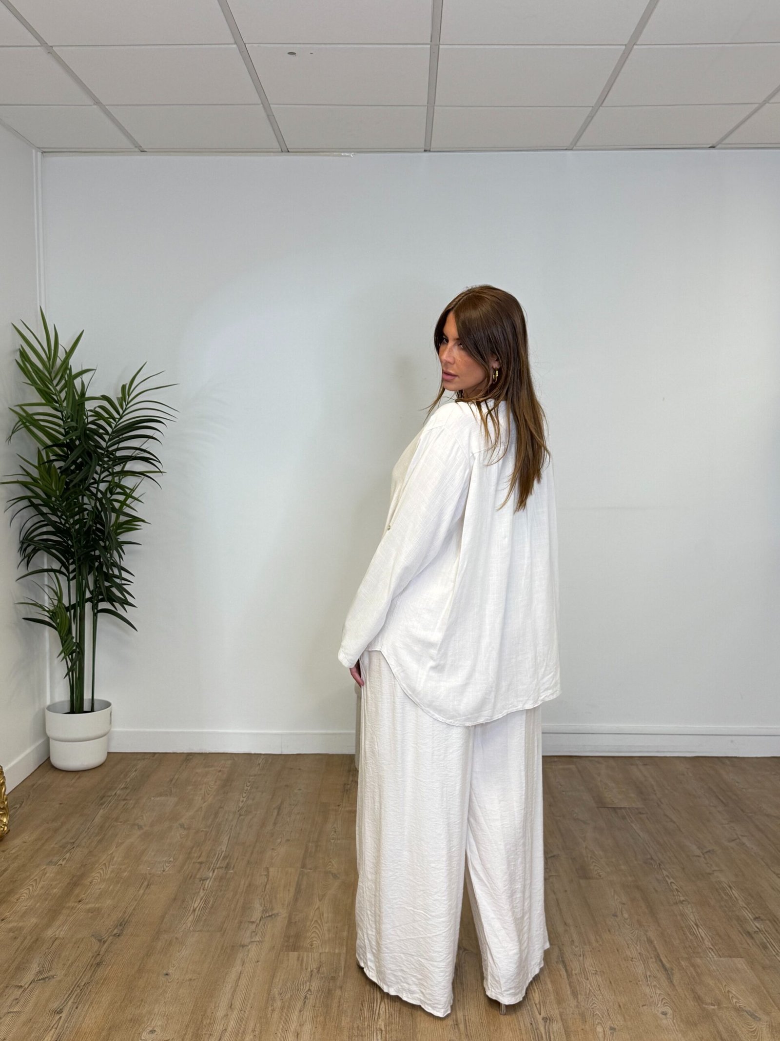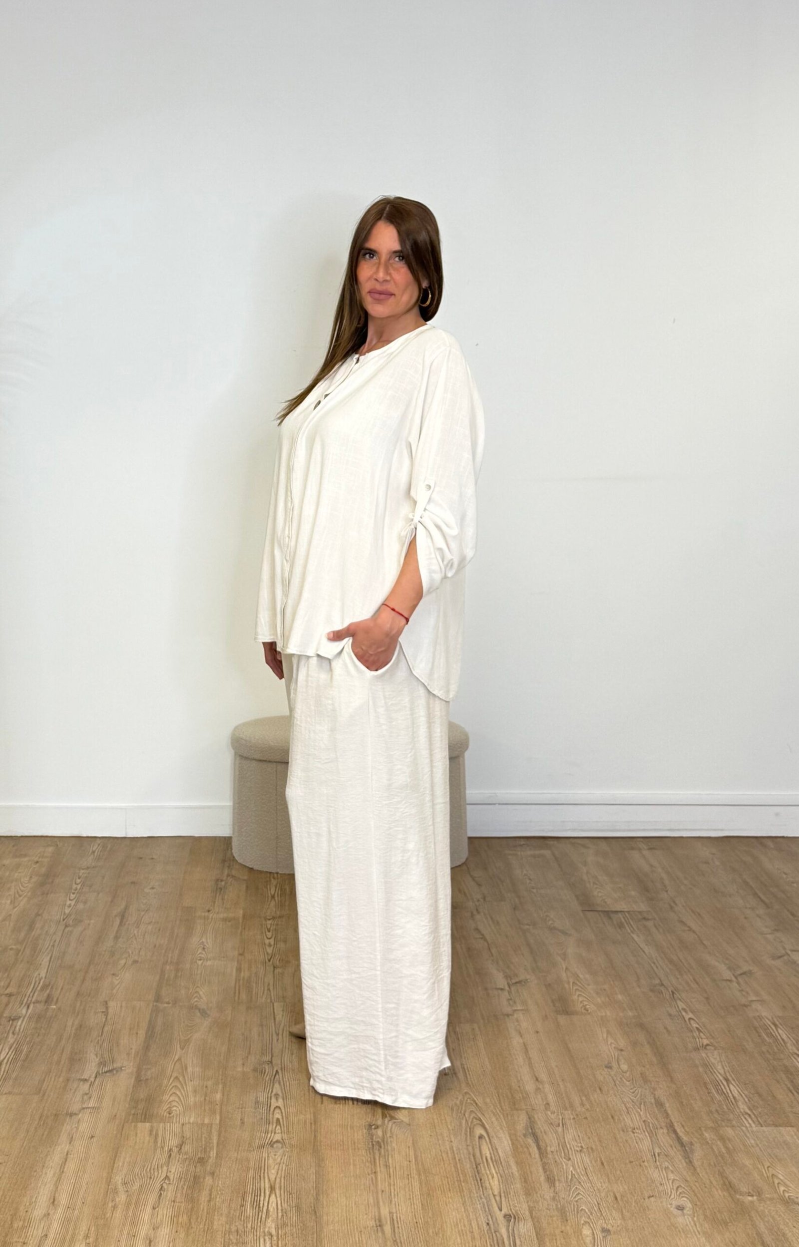 Portée sur le pantalon palazzo blanc de la même collection, elle compose un ensemble total look d’une cohérence absolue. En vêtement grande taille pensé comme une pièce de mode à part entière, elle s’adresse à celles qui s’habillent pour elles-même et pour personne d’autre.